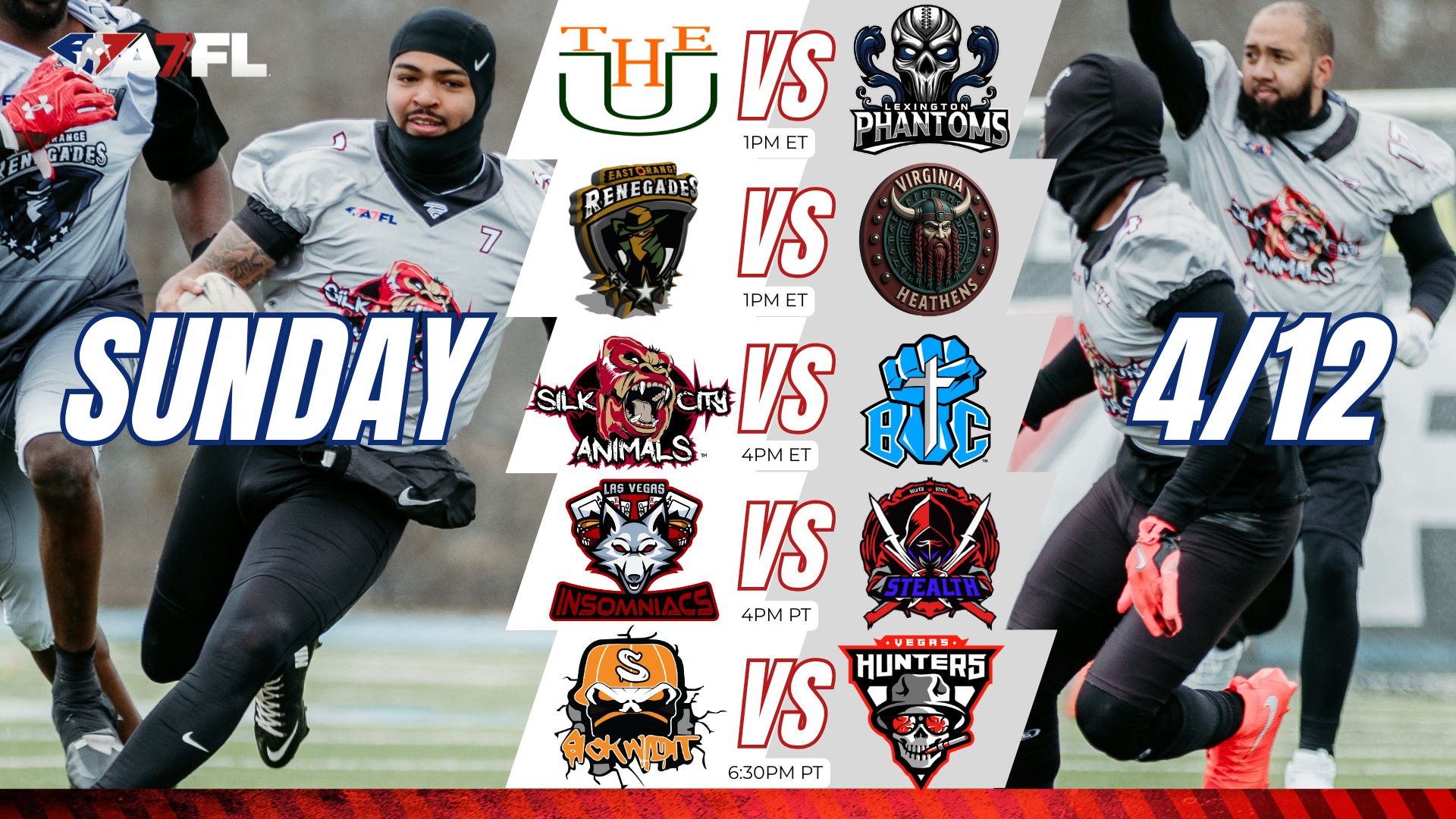 After a week off, the American 7s Football League returns Sunday, April 12 with a full slate of matchups across the East Coast and Las Vegas. The break gives teams time to reset, heal up, and prepare but it also raises the stakes.