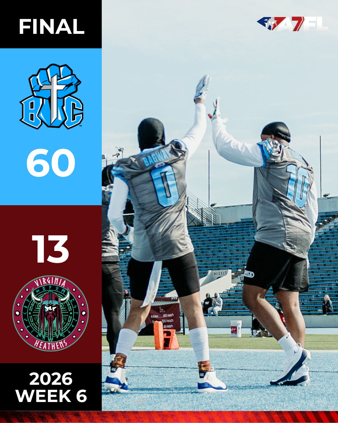 Trenton BIC put together the most dominant performance of Week 6, overwhelming the Virginia Heathens 60–13. BIC’s offense exploded for the highest point total of the week while the defense kept the Heathens from gaining momentum. The win strengthens BIC’s position in the Eastern Conference playoff race.