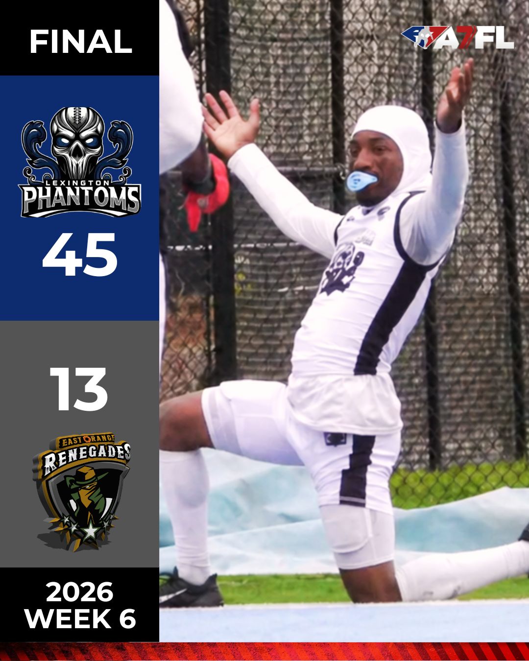 The Lexington Phantoms continued their strong run with a convincing 45–13 win over the East Orange Renegades. Lexington’s offense found rhythm early and kept the pressure on throughout the game, while the defense limited the Renegades’ scoring opportunities. The victory keeps the Phantoms firmly in the playoff race as they continue to climb the standings.