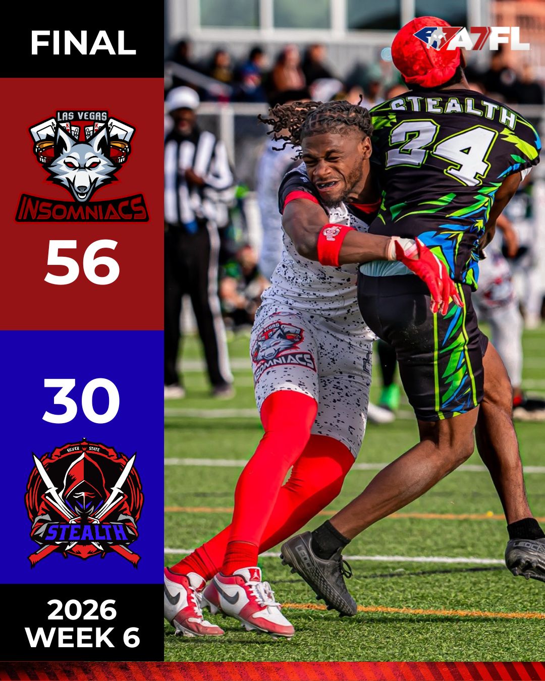 The Las Vegas Insomniacs delivered one of the most explosive offensive performances of the season, defeating the Silver State Stealth 56–30. Big plays and consistent scoring drives helped the Insomniacs pull away, while the Stealth battled throughout but couldn’t keep pace with the Vegas offense.